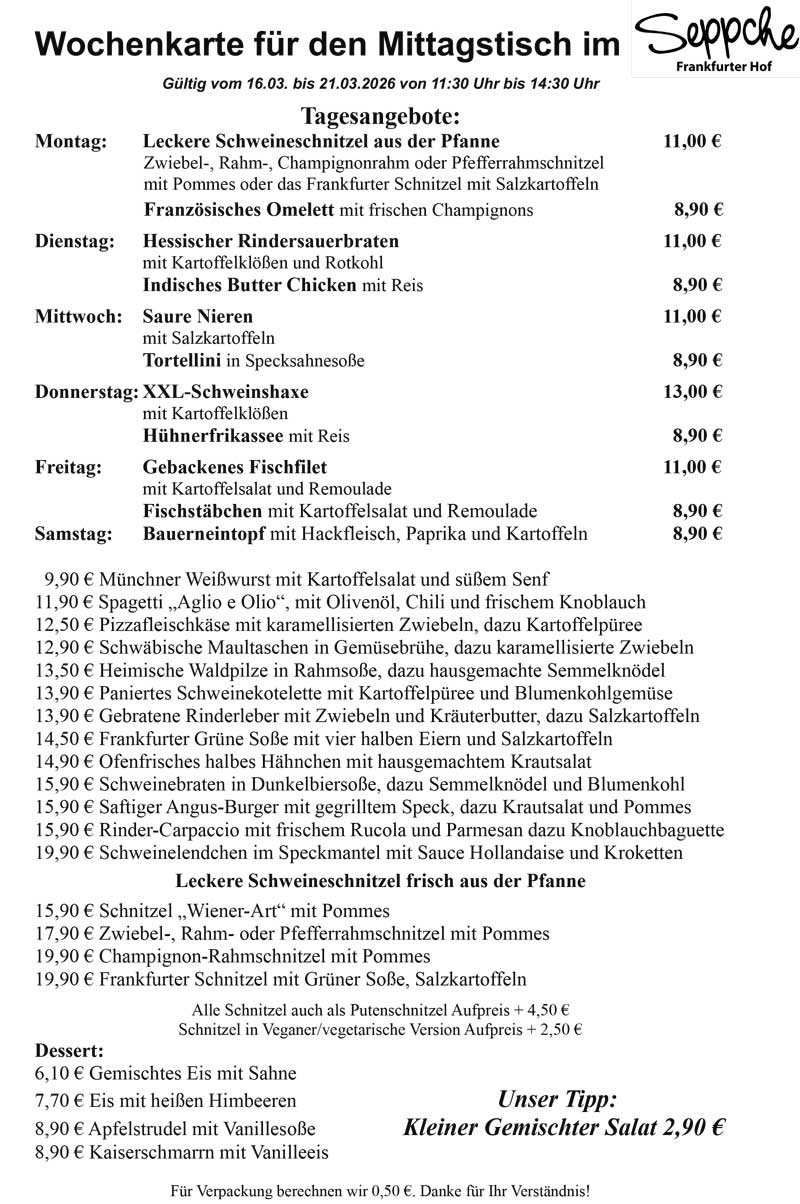 Freuen Sie sich auf gemütliche Stunden im Frankfurter Hof Seppche und auf eine reichhaltige Karte mit traditionellen Gerichten aus der Frankfurter Küche.