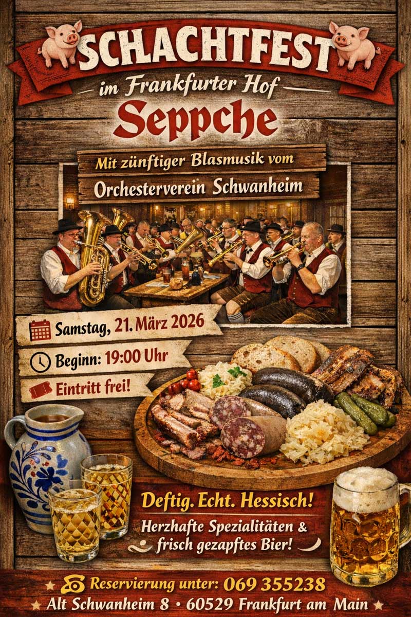 Freuen Sie sich auf unser traditionelles Schlachtfest im Frankfurter Hof Seppche mit herzhaften Spezialitäten, frisch gezapftem Bier und bester Stimmung. Für die passende musikalische Begleitung sorgt der Orchesterverein Schwanheim mit zünftiger Blasmusik.