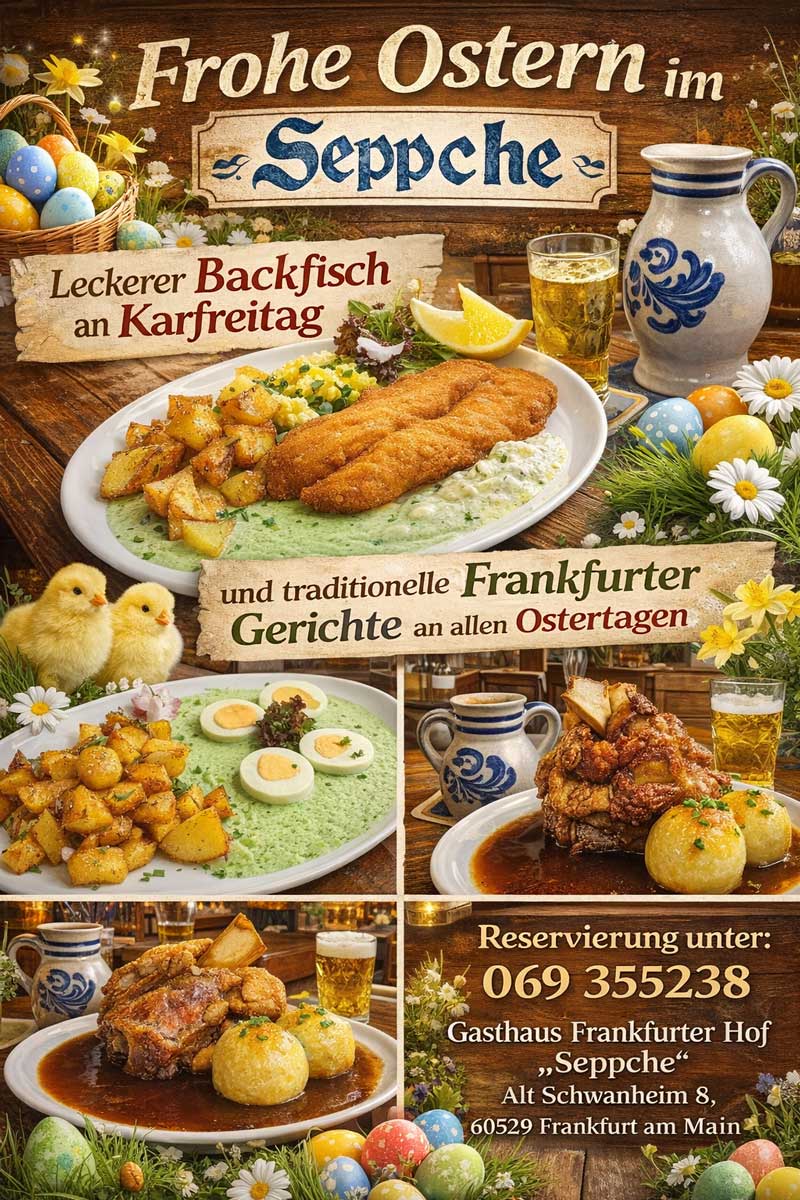 Freuen Sie sich auf gemütliche Stunden im Frankfurter Hof Seppche und auf eine reichhaltige Karte mit traditionellen Gerichten aus der Frankfurter Küche.